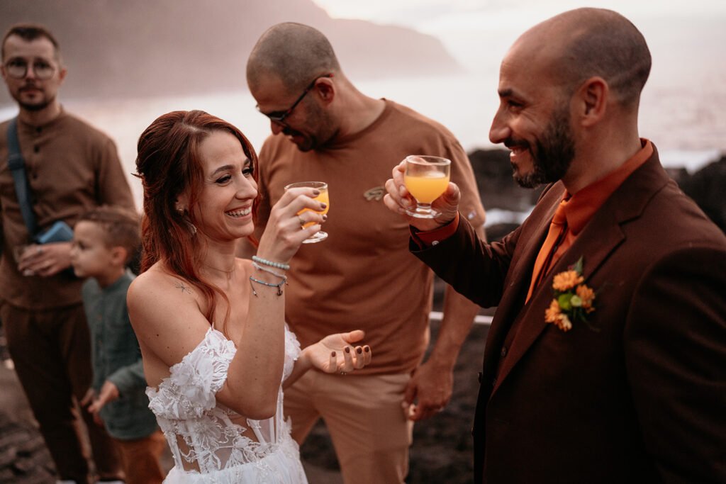 To ground their union in Madeiran culture, we performed a Poncha Ritual. Jennifer had prepared a custom ring box filled with black sand from that very beach. After the vows, the couple toasted their marriage with chilled, fresh Poncha served in shot glasses right there on the sand. It was authentic, local, and unforgettable.